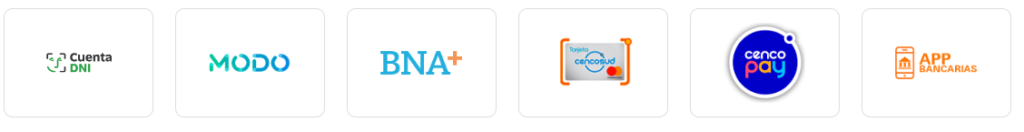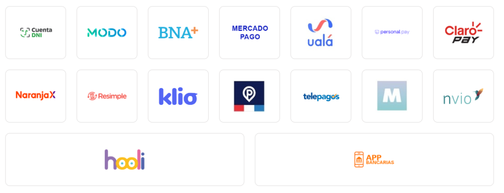 Modo, CDNI, BNA +, Mercado Pago, Uala, Plus pagos, Moni, Naranja x, Klio, Resimple, Cencosud, Telepagos, Nvio, Personal pay, Hooli, Claro Pay, App Bancarias.